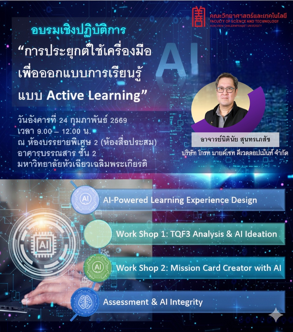 ขอเชิญเข้าร่วมโครงการการอบรมเชิงปฏิบัติการ เรื่อง “การประยุกต์ใช้เครื่องมือ AI เพื่อออกแบบการเรียนรู้แบบ Active Learning “ ข่าวประชาสัมพันธ์ โครงการการอบรมเชิงปฏิบัติการ เรื่อง “การประยุกต์ใช้เครื่องมือ AI เพื่อออกแบบการเรียนรู้แบบ Active Learning ” วันอังคารที่ 24 กุมภาพันธ์ 2569 เวลา 9.00 – 12.00 น. ณ ห้องบรรยายพิเศษ 2 (ห้องสื่อประสม) อาคารบรรณสาร ชั้น 2 scikm-master